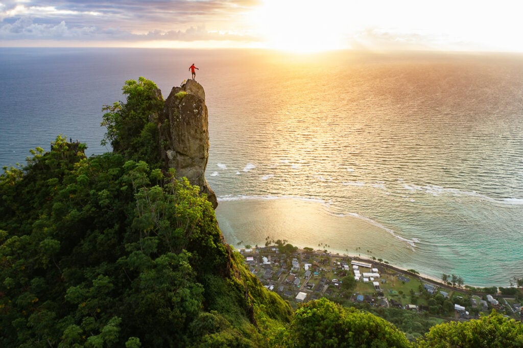 The Pali Puka hike on Oahu is a great trail for sunset as the sun rays sneak through a gap in the mountains casting light across the valley! There are plenty of roots and trees to grab onto in the early stages of this hike before you emerge onto the ridge for your first look at the views. The hike isn’t necessarily dangerous but much of the path is on the edge of a huge drop-off. From the first viewpoint, you can see Kaneohe, the Pali tunnels, and even China Man’s Hat on a clear day. Keep following the trail and another 5 or so minutes will bring you to the hole in the rock!