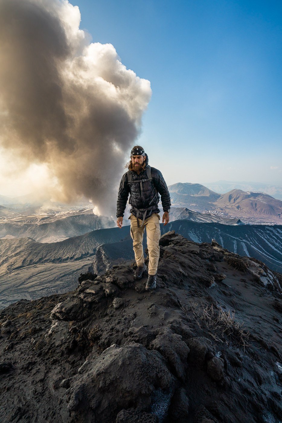 Atop the ridge, it was a very narrow path. A 50m+ drop on either side meant we had to focus on our steps until we reached a safer, wider spot on top of the ridge. We took a moment to relax up here, taking in the view of the beach and down to the volcanic cone at the other end of the coastline.