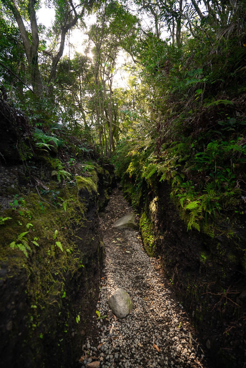 The trail begins with incline from the very first moment as you wind your way through the woodlands at the base of the volcano. It was a very beautiful part of the trail as the sunlight shone through the trees and into the mini canyons created by erosion on the path. At some points, the walls on either side of the trail were above head height, which added a unique atmosphere to the trail.