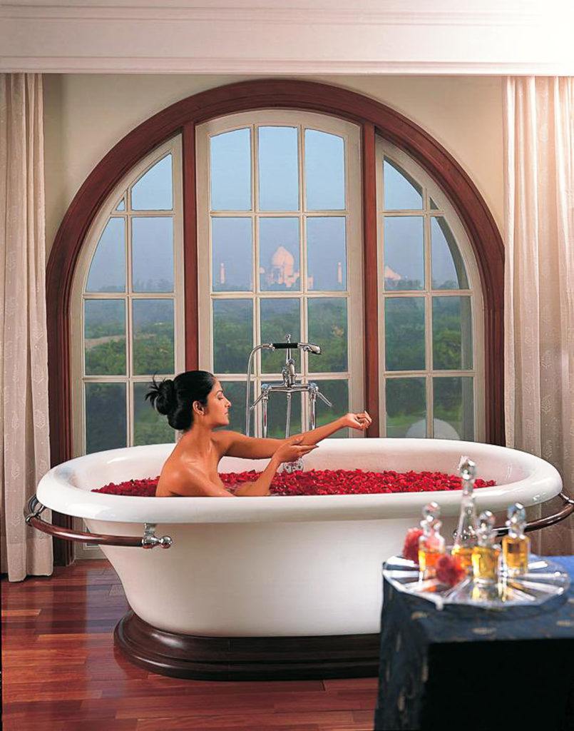 The Oberoi Amarvillas Agra (Luxury): A perfect view of the Taj Mahal from your large window room is not the only thing that The Oberoi Amarvillas Agra offers to its guests. The property is just incredible with a blend of stylish modern interior and large windows with a stunning view. It’s one of the most luxurious hotels in Agra near the Taj Mahal.